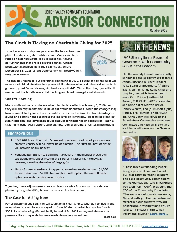 The Community Foundation is proud to work with professional advisors—attorneys, accountants, financial planners, and others—in the Lehigh Valley and beyond as they assist their clients in establishing and growing a charitable legacy. Whatever cause your client wishes to support, the Community Foundation can serve as the long-term steward of their charitable giving and the legacy they envision.