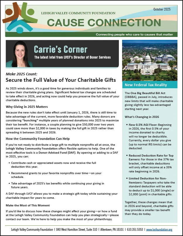 In this issue, we spotlight the enduring power of philanthropy—even during uncertain times—highlighting key trends, timely legislative updates, and the growing momentum behind donor-advised funds. You’ll also learn why many are choosing to move from private foundations to simpler, more flexible giving solutions, and how LVCF is exploring impact investing to align your financial stewardship with your values. Dive in and discover how your giving continues to strengthen the Lehigh Valley in meaningful, forward-thinking ways.